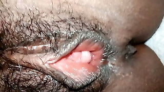 Frigging和拉伸我的黑色Gf的皮毛复盖普纳尼在微距拍摄视频