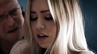 苗条的金发女郎在她的小弟弟面前享受BBC,然后让他试试她的肯定的阴部