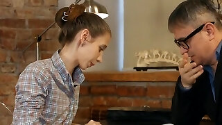 苗条的新的女孩在乳白色的丝袜是准备好让她的插槽性交