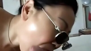 Asian girl with sunglasses gargles cock, while getting fingered.