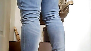 白色的小鸡在蓝色牛仔裤和外套撒尿在厕所